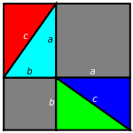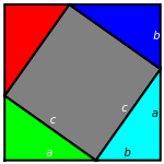 Inside this large square, place the right-angled triangle in such a way that you form four congruent triangles and a smaller square with side length c.
